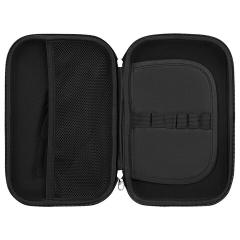 Пенал прямоугольной формы с одним вместительным отделением. Внутри откидная планка с органайзером на 6 предметов, а также боковой карман из сеточки. Вмещает до 100 канцелярских предметов стандартного размера. Пенал оснащен молнией с двумя металлическими бегунками.