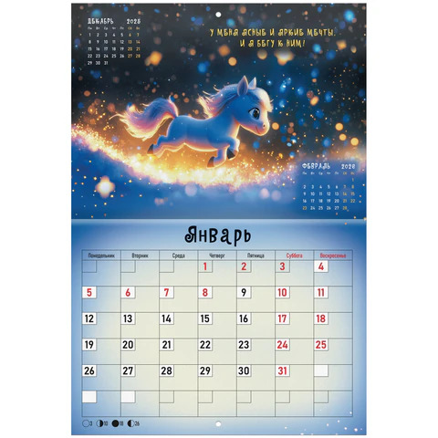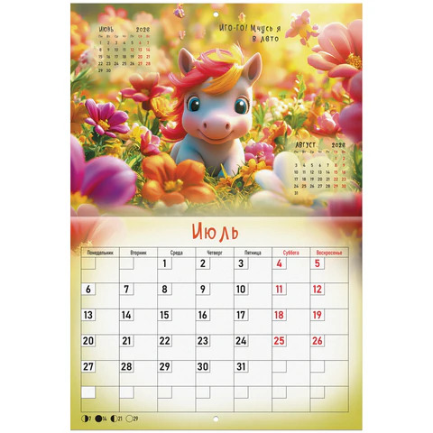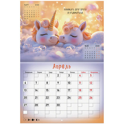 Яркая, красочная картинка дополнена календарной сеткой на месяц с местом для записи на каждый день. Содержит 12 листов. Блок календаря напечатан на мелованной бумаге плотностью 130 г/м2. Обложка изготовлена из мелованной бумаги плотностью 230 г/м2. Размер – 29,5х21,3 см, в развороте – 29,5х42,6 см. Дополнен отверстием для удобства крепления. Поставляется в индивидуальной упаковке (полибэг) с европодвесом и прокладкой из гофрокартона, что создает товару дополнительную защиту.