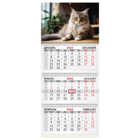 Календарь квартальный на 2026 г., 3 блока, 3 гребня, бегунок, офсет, BRAUBERG, "Кот", 116780 |