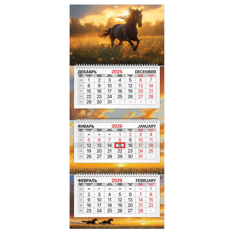 Офисный календарь на 2026 год на 3 гребнях. Для удобства планирования состоит из 3 блоков с календарными сетками на три месяца – предыдущий, текущий и следующий. Курсор-бегунок выделяет текущую дату.