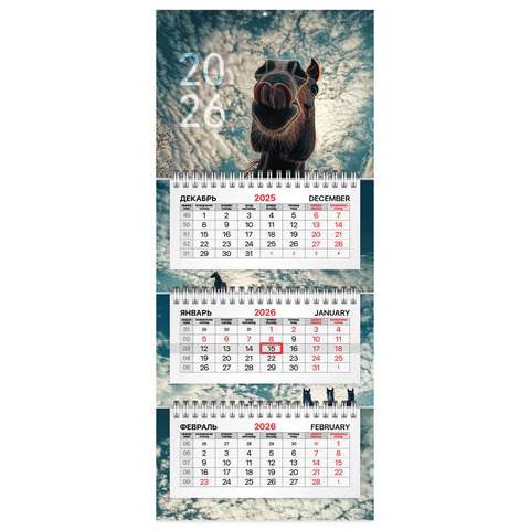 Офисный календарь на 2026 год на 3 гребнях. Для удобства планирования состоит из 3 блоков с календарными сетками на три месяца – предыдущий, текущий и следующий. Курсор-бегунок выделяет текущую дату.