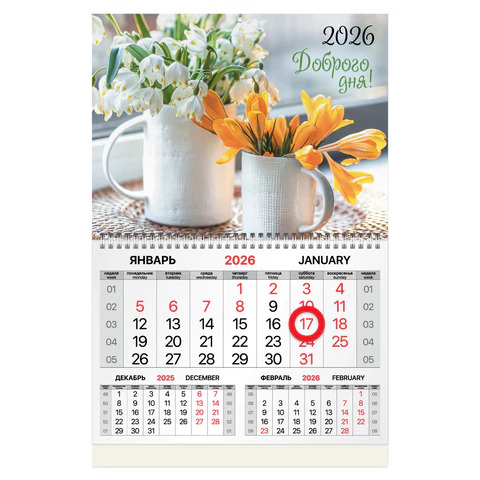 Офисный календарь на 2026 год на гребне. Состоит из 1 блока с календарными сетками на три месяца с магнитным курсором. Блок календаря напечатан на мелованной бумаге плотностью 80 г/м2. Подложка изготовлена из мелованного картона плотностью 250 г/м2. Магнитный курсор-бегунок выделяет текущую дату. Вертикальное расположение. Размер – 33,5х50,3 см.