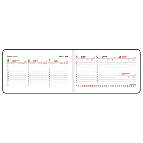 Дополнением является закладка-ляссе, с помощью которой при необходимости можно быстро открыть еженедельник на нужной странице. Для заметок в еженедельнике есть 7 страниц в конце внутреннего блока. Помимо прочего, еженедельник снабжен обширным справочным материалом.