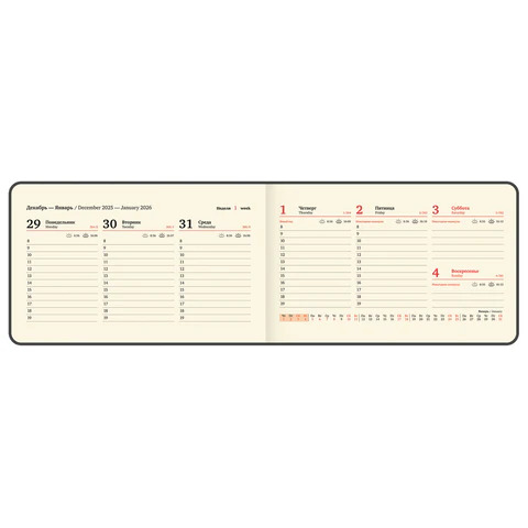 Внутренний блок включает 64 листа тонированной бумаги плотностью 70 г/м2. Благодаря малому формату А6 (105х160 мм) еженедельник удобно использовать как в офисе, так и на выездных деловых встречах. Гибкая обложка черного цвета, стилизованная под гладкую кожу, подходит для горячего тиснения.