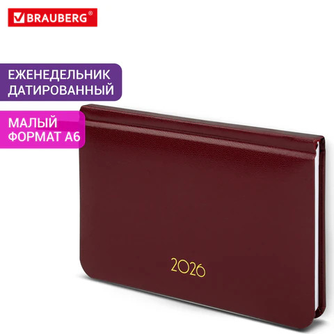 Еженедельник датированный 2026, МАЛЫЙ ФОРМАТ 95х155 мм, А6, BRAUBERG "Select", балакрон, бордо, 117194 |