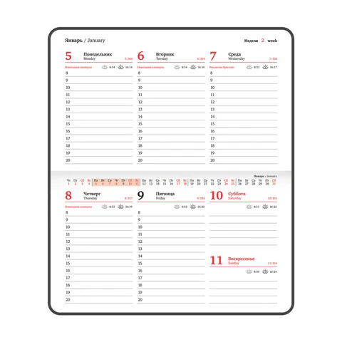 Дополнением является закладка-ляссе, с помощью которой при необходимости можно быстро открыть еженедельник на нужной странице. В конце внутреннего блока есть 7 страниц для записей и заметок. Обширный справочный материал расширяет функциональность еженедельника.