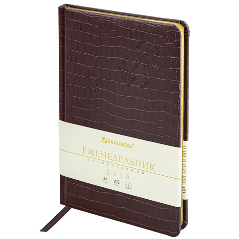 Внутренний блок включает 64 листа тонированной бумаги плотностью 70 г/м2. Благодаря стандартному формату А5 (145х215 мм) еженедельник удобно использовать как в офисе, так и на выездных деловых встречах. Твердая обложка темно-коричневого цвета, стилизованная под кожу крокодила, подходит для горячего тиснения. Срез еженедельника покрыт золотой фольгой, что придает ему особый шарм.