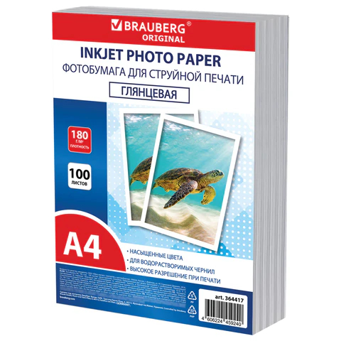 | Фотобумага глянцевая, А4, 180 г/м2, односторонняя, 100 листов, ПАКЕТ, BRAUBERG ORIGINAL, 364417 |