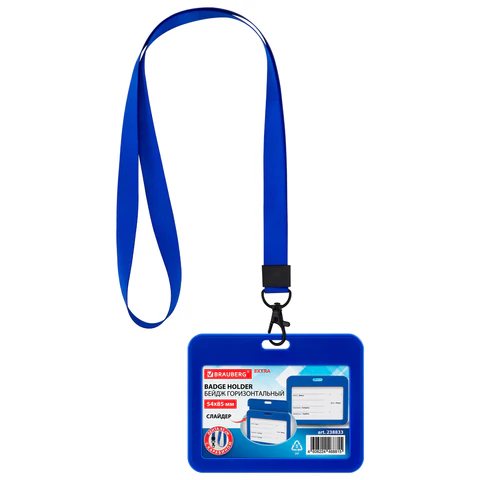 | Бейдж горизонтальный (54х85 мм), лента 45 см с карабином, СЛАЙДЕР, синий, BRAUBERG EXTRA, 238833 |
