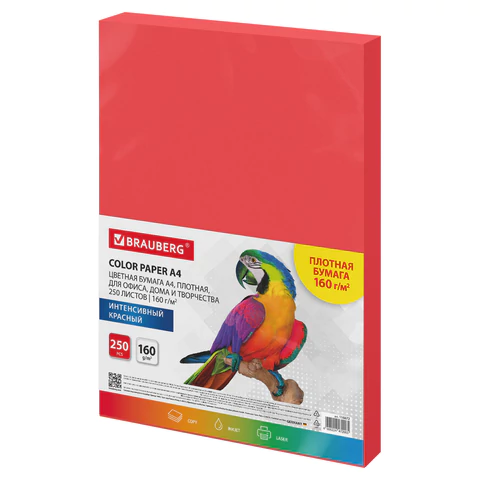 | Бумага цветная ПЛОТНАЯ BRAUBERG, А4, 160 г/м2, 250 л., красная, интенсив, для печати, творчества, 116672 |